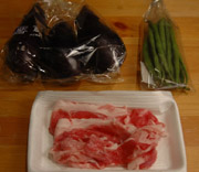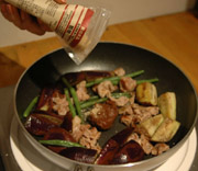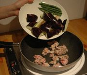 A火が通ったら、下ごしらえした茄子とさんど豆を入れてさらに炒める。
